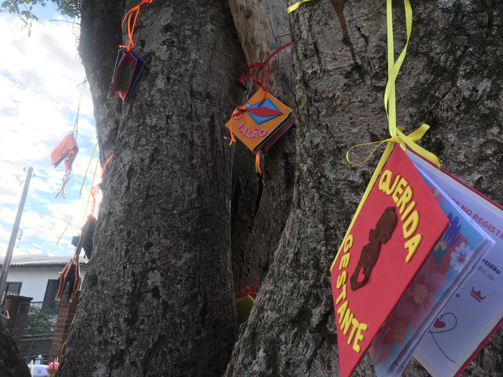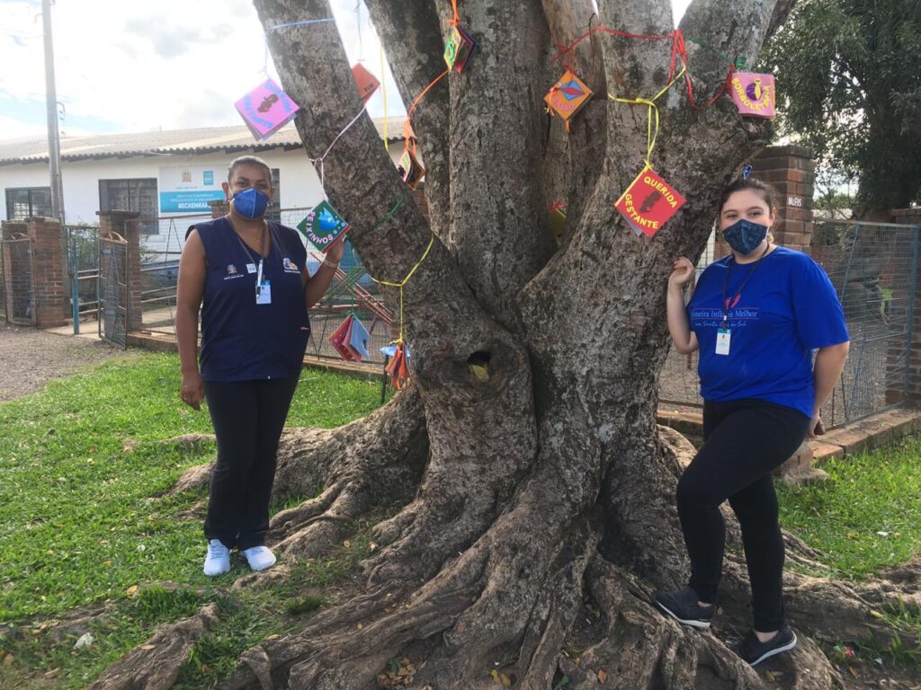A árvore de grande porte que fica em frente ao conhecido Casarão, no Loteamento Beckenkamp, ficou mais colorida na tarde desta terça-feira, 23. Nela, profissionais do programa Primeira Infância Melhor (PIM) penduraram livrinhos de histórias para crianças de até 4 anos e com orientações para gestantes daquela região. A atividade, chamada de A árvore de histórias, foi uma iniciativa da estagiária Larissa Gabe de Almeida, que buscou por meio dela dar continuidade aos acompanhamentos de famílias carentes durante a pandemia, mas de uma forma segura para todos. Para isso, ela contou com a ajuda da agente de saúde do bairro, Vanessa Cristina dos Santos.