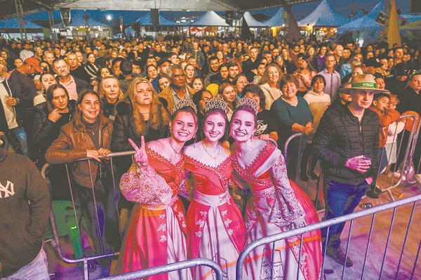 As soberanas de Vera Cruz: as princesas Mariana Luiza Tatsch e Isadora da Silva e a rainha Daniéli Daiani Schroeder em um dos shows, com total integração junto com o público