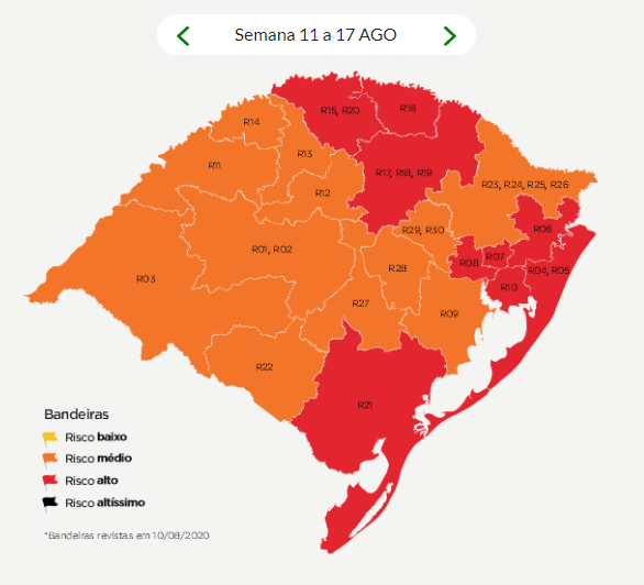 Divulgado na sexta-feira, 7, o mapa preliminar classificou 12 regiões como de alto risco epidemiológico. Depois de análise dos 25 pedidos de reconsideração enviados por municípios e associações regionais, o Gabinete de Crise acatou o recurso de três regiões, resultando em 12 regiões com bandeira laranja (risco médio).