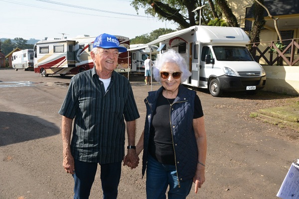 Foi o par romântico caminhando apressadamente pelo Parque da Oktoberfest que chamou atenção, na tarde desta quarta-feira, 27. “Estamos circulando pelo parque para encontrar um bom lugar para estacionar nosso carro”, disse o senhor Ruy Renato Engelmann, de 85 anos. Acompanhado pela esposa, Marlene, de 84 anos, vieram de Novo Hamburgo para participar de mais uma edição de um encontro do Rancho Móvel em Santa Cruz do Sul. “Adoramos esta cidade, é maravilhosa”, disse Marlene.