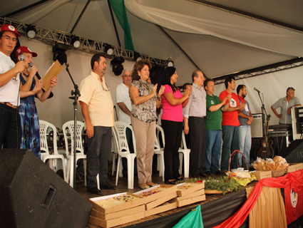 No palco: Gilberto Tutenhagen do MPA, Gustavo Henriques da Rosa do BB, Eliane Matiolle da CEF, a prefeita Kelly Moraes, Tarso Genro, Claudio Pereira presidente do Irga e lideranças ligadas ao Movimento