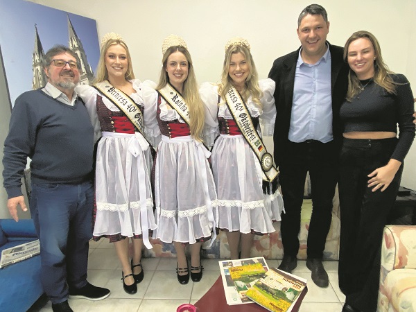 O Riovale Jornal recebeu na última terça-feira, 12, a visita da corte da 40ª Oktoberfest de Santa Cruz do Sul. A rainha Rafaela Nicknig e as princesas Amanda Regina Werner e Sofia Cristina Pretzel foram eleitas no último sábado, 9, e já estão em ritmo intenso no trabalho de divulgação do evento, que será realizado de 9 a 12, de 16 a 19 e de 23 a 26 de outubro.