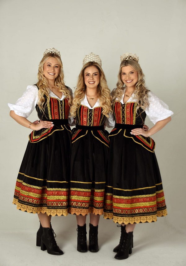 O legado de quatro décadas da Festa da Alegria está presente nos trajes do trio de soberanas da 40ª Oktoberfest de Santa Cruz do Sul, formado pela rainha Rafaela Nicknig e pelas princesas Amanda Regina Werner e Sofia Cristina Pretzel. Os vestidos, oficiais e de passeio, foram apresentados à comunidade em evento realizado na tarde desta sexta-feira, 29, em frente ao Palacinho, na Praça da Bandeira. Os modelos, desenhados e produzidos pelo Atelier Joana Tornquist, traduzem em cada detalhe o espírito do tema desta edição: Reviva as Memórias, Celebre as Tradições. Cores, texturas e acabamentos se unem para narrar a história que conectam passado e presente, em uma homenagem ao patrimônio cultural que molda a identidade de Santa Cruz do Sul.