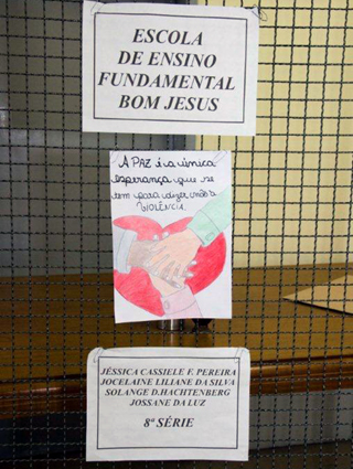 “A paz é a única esperança que se tem para dizer não à violência.” Este será o slogan da 5ª Semana Municipal de Prevenção à Violência, que ocorre entre os dias 19 e 25 de agosto. A frase ilustrada com mãos sobre um coração foi criada pelas alunas Jéssica Cassiele Pereira, Jocelaine Liliane da Silva, Solange Hachtenberg e Jossane da Luz, da 8ª série da Escola Municipal de Ensino Fundamental Bom Jesus. O trabalho passou pela avaliação de uma comissão julgadora e foi anunciado vencedor do concurso na quarta-feira, 19.