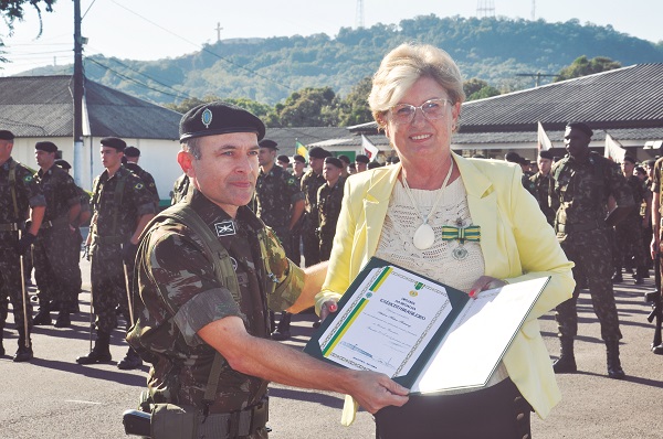 Durante a cerimônia, foi entregue à prefeita Helena Hermany a Medalha do Exército Brasileiro. A honraria distingue cidadãos e instituições civis brasileiras ou estrangeiras, que tenham praticado ação destacada ou serviço relevante em prol do interesse e do bom nome da corporação. “Na data de hoje (ontem), renova-se o compromisso do Exército Brasileiro de integrar o recrutamento da pátria e da perfeita identificação dos ideais do povo brasileiro e a integração com a sociedade. Integração essa materializada pela justa e merecida homenagem à prefeita de Santa Cruz do Sul”, afirmou o comandante.