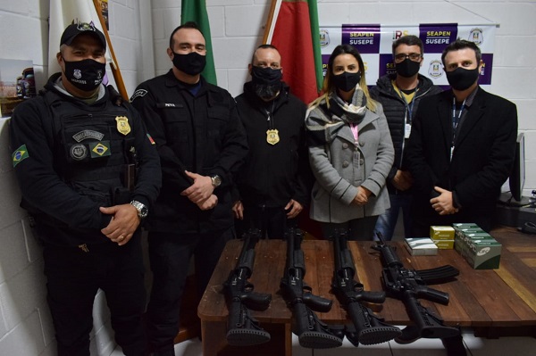 O Departamento de Segurança e Execução Penal (DSEP) entregou na tarde de sexta-feira, 18, material bélico para a Penitenciária Estadual de Venâncio Aires (PEVA). A ação faz parte do programa da Seapen/Susepe que visa o reaparelhamento das Unidades Prisionais, sendo na ocasião recebidas Espingardas Calibre.12 PUMP/CBC – MILITARY 3.0- RT, Fuzil T4 5.56x45mm, carregadores e munições dos respectivos calibres. A equipe do DSEP também visitou as estruturas da Delegacia Penitenciária Regional e Instituto Penal de Monitoramento Eletrônico, no Município de Santa Cruz do Sul.