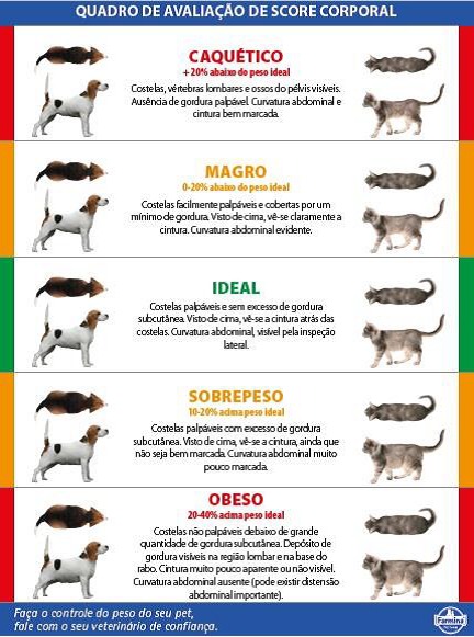 Nas embalagens de rações há no rótulo a quantidade de comida indicada. É importante seguir essa indicação? Para a médica veterinária Tamara, a quantidade de alimento na embalagem deve ser o ponto de partida para a alimentação, mas pode ser modificado conforme metabolismo individual do animal. “É importante avaliar o escore corporal, pois conforme o nível de atividade e a própria digestão do alimento, alguns vão necessitar de mais ou menos quantidade”, pontua. “Caso tenha que reduzir abaixo do menor nível e seu bichinho continuar gordinho, está na hora de passar para a ração Light”, orienta. A avaliação do escore corporal é feita pela “cinturinha”, segundo Tamara e podem ser vistas na imagem abaixo.