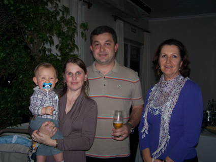 Ane Bisognin com o pequeno Lucas ao colo, acompanhada do marido Wilson e da esposa do gerente geral do BB, Maria Helena Rossato