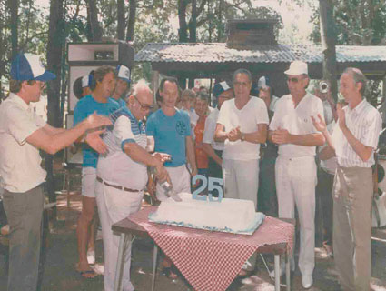 Ex-presidentes na comemoração dos 25 anos da AABB, inclusive a presença do 1º presidente, Pojucan, cortando o bolo