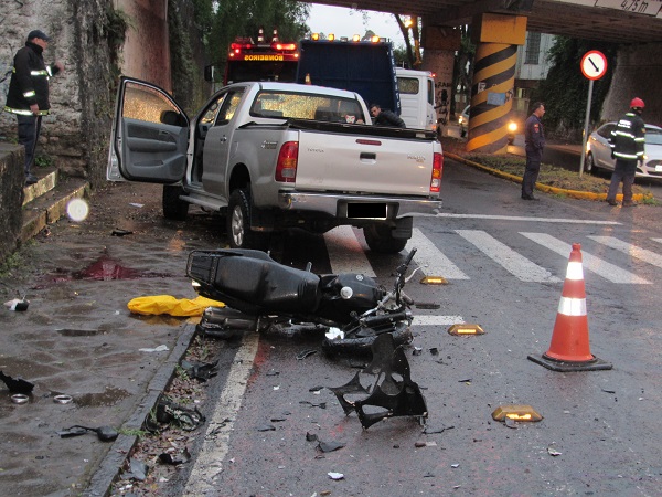 Um violento acidente de trânsito foi registrado no final da tarde de hoje, 26, na Avenida Paul Harris, nas proximidades da ponte seca do quartel. A colisão envolveu uma camionete Hilux e uma motocicleta Yamaha Fazer. Com o impacto, o condutor da moto, identificado como Sérgio Luis Nyland, 48 anos, sofreu ferimentos graves, sendo encaminhado pela ambulância do Serviço de Atendimento Móvel de Urgência (Samu) para atendimento médico no Hospital Santa Cruz, onde permanece internado em estado grave. O motorista da caminhonete, de 42 anos, nada sofreu. O caso foi registrado pela Brigada Militar e Fiscalização de Trânsito.