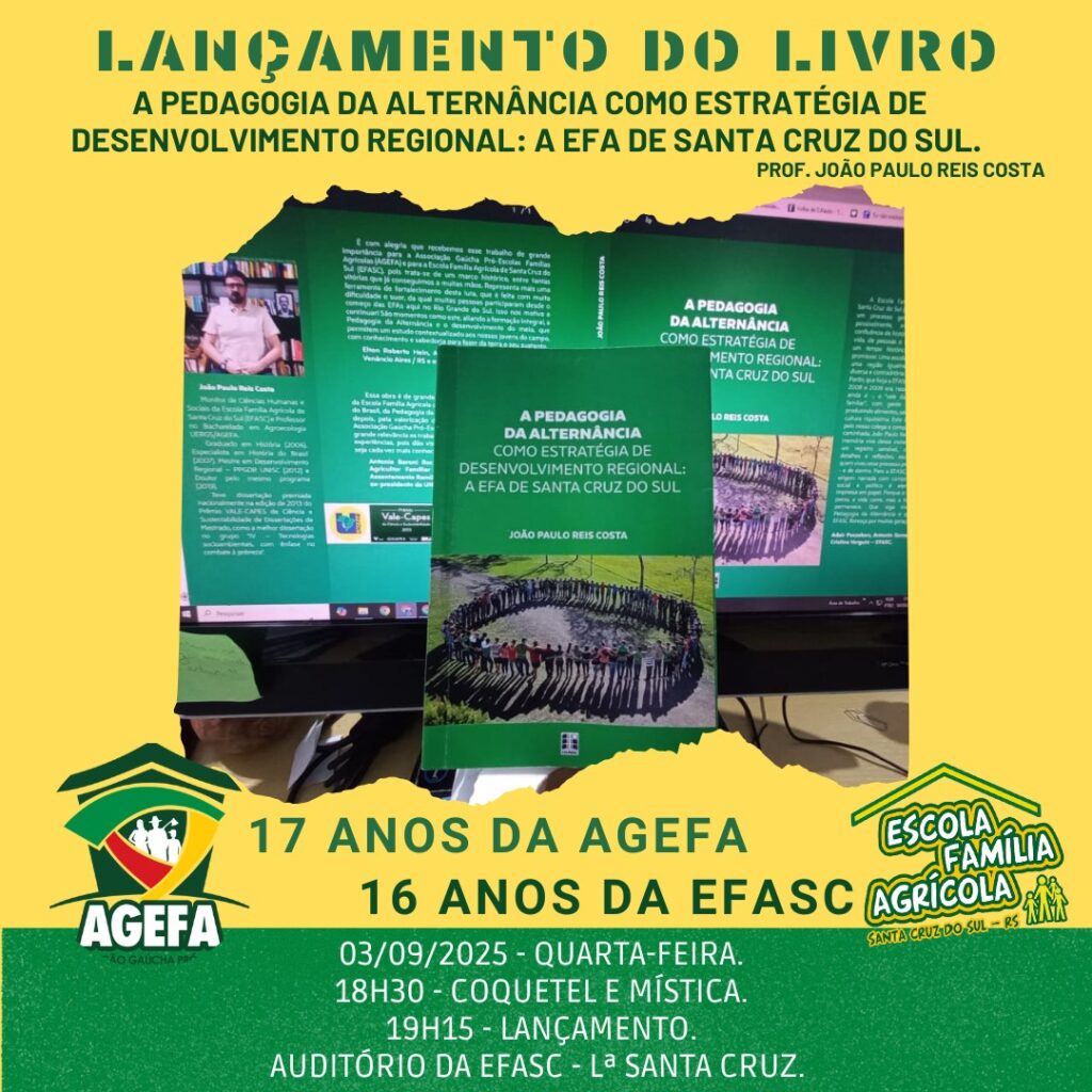 Os 17 anos da Associação Gaúcha Pró-Escolas Famílias Agrícolas (AGEFA), e os 16 anos da implantação da Escola Família Agrícola de Santa Cruz do Sul (EFASC) serão retratados em publicação do historiador e doutor em Desenvolvimento Regional pela Universidade de Santa Cruz do Sul (UNISC), João Paulo Reis Costa. O lançamento do livro está previsto para o dia 3 de setembro, 18h30, na sede da escola, em Linha Santa Cruz.