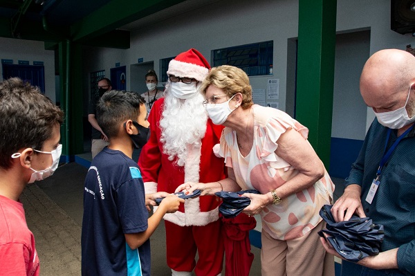 A distribuição, em ambas as escolas, foi uma surpresa para os alunos, que reunidos no pátio, receberam os materiais das mãos da prefeita Helena Hermany, e do secretário municipal de Educação, João Miguel Wenzel. Outra surpresa, especialmente para os pequenos, foi a visita do Papai Noel, que levou uma mensagem para as crianças, distribuiu balas e abraços e ainda participou da entrega dos itens escolares.