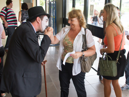 Caracterizado de Carlitos, famoso personagem de Chaplin, o palestrante Rodrigo recepcionou os professores