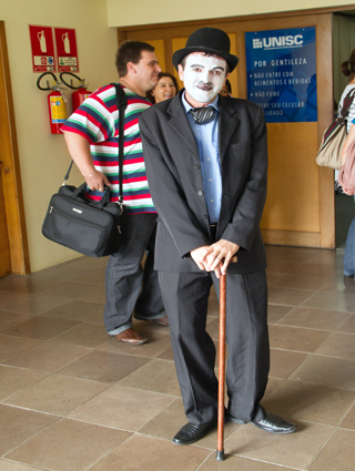 Além de pedagogo, o santa-cruzense Rodrigo Ribeiro é especialista em docência do ensino superior, ator e diretor de teatro. Muito original, caracterizou-se de Carlitos, famoso personagem de Charles Chaplin, e sem que ninguém soubesse que ele era o palestrante, recepcionou os professores na entrada do Auditório Central. “O professor também atua. Educar é uma arte e a criatividade de quem ensina reflete positivamente em quem aprende”, proferiu. Atualmente Rodrigo reside em Porto Alegre, onde mantém o Instituto de Ensino e Cultura Zoom.
