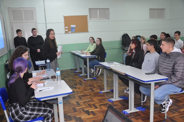 A quinta-feira, dia 11, é marcada por duas datas especiais Dia do Advogado e Dia do Estudante. E na semana em que se comemora estes dois importantes eixos da sociedade, a Escola Estadual de Ensino Médio Ernesto Alves de Oliveira, de Santa Cruz do Sul, realizou uma aula diferente para os alunos do Ensino Médio. O Riovale Jornal acompanhou a simulação de um tribunal do júri realizado pelos estudantes da turma 2B, coordenados pelo professor Marco Aurélio da Silva, mestre em Ciências Sociais e Educação e que ministra a disciplina de Filosofia. O objetivo do projeto é desenvolver as habilidades e competências, preparação para vivências na sociedade contemporânea, além de fomentar o despertar da vocação profissional.