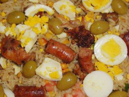 Aqueça em uma panela o óleo, refogue a linguiça até dourar e reserve. Na mesma panela, refogue o frango aos poucos até dourar e reserve. Em outra panela aqueça o azeite de oliva, refogue a cebola ralada, o tomate, o pimentão, acrescente a linguiça e o frango e mexa até formar um molho. Acrescente o arroz e mexa bem. Adicione água fervente até ao ponto de cozinhar o arroz. Deixe secar a água, e depois abafe para enxugar.