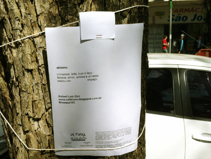No Dia da Árvore, comemorado no dia 21 de setembro, a jornalista e professora Fabiana Piccinin realizou uma ação um tanto diferente. Junto com o professor Demétrio de Azeredo Soster e Claudete Radunz, distribuíram 25 poemas, em 25 árvores de Santa Cruz do Sul.