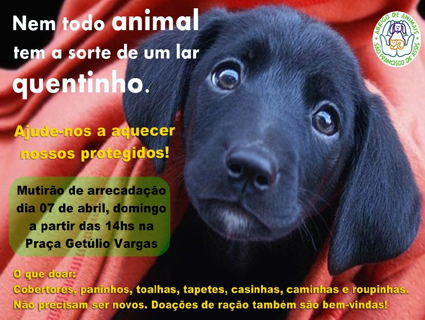 Campanha para arrecadar cobertores e mantas aos animais acontece neste domingo a partir das 14h na Praça Getúlio Vargas