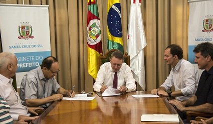 Na manhã desta quarta-feira, 3, no Salão Nobre do Palacinho, o prefeito Telmo Kirst e o presidente da Associação Santa-cruzense de Apicultores (ASA), Almiro Martin, assinaramo termo de cooperação para a captura e preservação dos enxames de abelhas (ápis mellífera) dentro do perímetro urbanodo município. O prefeito também sancionou a Lei nº 7.503, de 19 de janeiro de 2016, que autoriza o Poder Executivo a firmar o referido termo. O ato contou com a presença dos secretários de Meio Ambiente, Saneamento e Sustentabilidade, Raul Fritsch e de Agricultura, Licério Agnes.