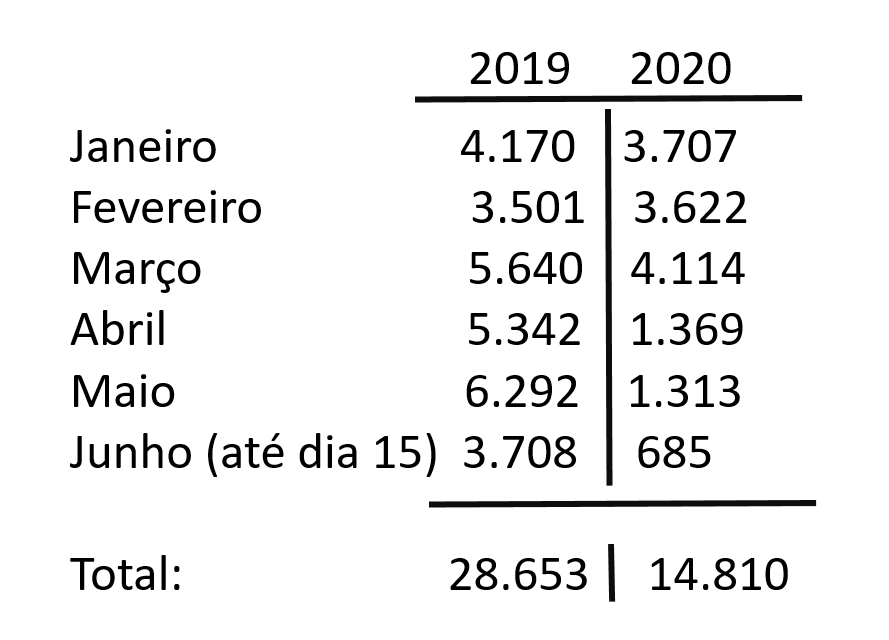 O total de consultas realizadas em 2020 só não é ainda mais baixo porque em janeiro, fevereiro e março os números se mantiveram estáveis. O mês com a maior diferença foi maio: em 2019 foram 6.292 atendimentos e em 2020 foram 1.313.