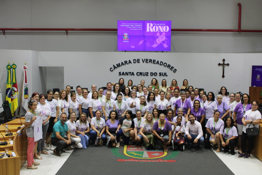 O Poder Legislativo de Santa Cruz do Sul realizou no início da noite desta quinta-feira, dia 27, uma audiência pública para debater a conscientização sobre doenças crônicas e neurológicas, como Fibromialgia, Lúpus, Alzheimer e outras condições debilitantes, dentro do movimento “Fevereiro Roxo”. Em torno de 100 pessoas participaram do encontro, entre elas uma comitiva vinda de Cachoeira do Sul.
