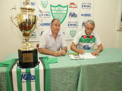 O Avenida deu na tarde de ontem, dia 12, mais um grande passo visando o Campeonato Gaúcho 2012. O proprietário do Miller Supermercados, Celso Müller, e o presidente do Esporte Clube Avenida, Jair Eich, assinaram o contrato concretizando novamente a parceria. “É uma das bandeiras do Miller o esporte hoje em Santa Cruz do Sul. O público de Santa Cruz merece um esporte bom aqui, de boa qualidade, e no Avenida o esporte é tratado com seriedade”, enfatiza o proprietário do Miller Supermercados, Celso Müller.