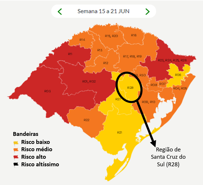 O Governo do Estado realizou a sexta atualização do modelo de Distanciamento Controlado por bandeiras no sábado, 13. A região de Santa Cruz do Sul (R28) saiu da bandeira laranja de risco médio e retornou para a bandeira amarela de risco baixo para contaminação por Covid-19. Com isso, as medidas se tornam menos rígidas para o enfrentamento da pandemia, e assim, algumas pessoas acreditam que o município está fora de perigo. Conforme Rosemari Hofmeister, integrante do Gabinete de Emergências e presidente da Ordem dos Advogados do Brasil (OAB) em Santa Cruz, a população precisa entender que a região não está entrando em uma normalidade, já que o risco da situação mudar continua.