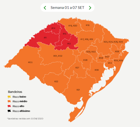 Com isso, apenas quatro regiões (Santo Ângelo, Cruz Alta, Ijuí e Santa Rosa) ficaram com bandeira vermelha (risco alto) – mesmo número registrado há 10 semanas, quando o Estado ainda era dividido em 20 regiões Covid. Desde 7 de julho, são consideradas 21 regiões.
