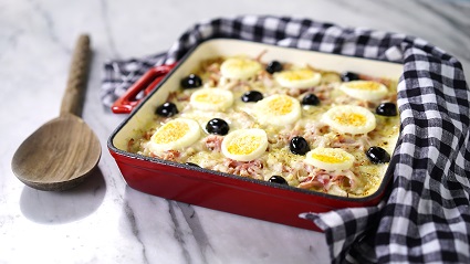 Em uma panela, derreta a manteiga, junte a farinha e em seguida o leite, sempre mexendo até ficar consistente. Tempere com uma pitada de noz moscada, sal e pimenta e reserve. Aqueça uma frigideira, regue com azeite e doure a cebola. Reserve. Disponha as batatas em um refratário, cubra com o molho e com as rodelas de cebola. Adicione o presunto, a mozarela, os ovos, o parmesão e as azeitonas. Leve ao forno preaquecido, a 180°C, por, aproximadamente, 30 minutos ou até que o queijo esteja gratinado.
