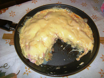 Cubra as batatas com uma camada de presunto e por cima duas camadas de mozarela e para finalizar coloque os ovos batidos com o sal e o orégano, abafe novamente para cozinhar os ovos e depois é só servir.