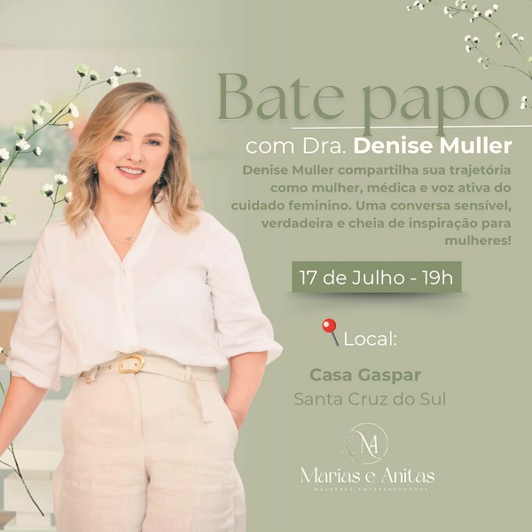 Nesta quinta-feira, 17, tem reunião para um momento especial de troca, inspiração e fortalecimento feminino. Neste encontro exclusivo, que ocorre a partir das 19 horas na Casa Gaspar, a doutora Denise Muller compartilhará sua trajetória como mulher, médica e voz ativa do cuidado feminino, em uma conversa sensível e inspiradora.