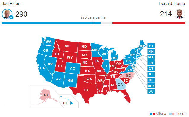 Após quatro dias de projeções, especulações e contagem de votos, o democrata Joe Biden foi eleito no sábado, 7, o 46º presidente dos Estados Unidos (EUA). Com a conquista dos 270 delegados do colégio eleitoral necessários, Biden teve sua vitória decretada na Pensilvânia, conquistando um total de 290 delegados.