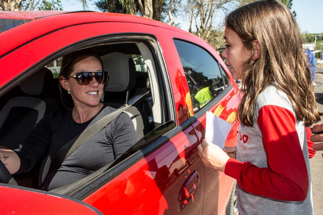 A medida que os carros passavam pela Avenida Orlando Oscar Baumhardt eram abordados pela fiscalização defronte à escola, onde dezenas de alunos aguardavam em fila. Sempre acompanhados pelos parceiros da iniciativa, um menino e uma menina se dirigiam duplas até a janela do motorista e entregavam a ele ou a ela, uma pequena cartinha. Quase uma centena foram distribuídas durante a ação.