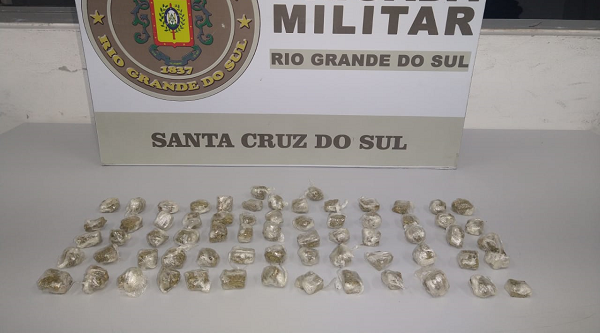 Na noite de sexta-feira, 6, a Brigada Militar de Santa Cruz do Sul, através dos policiais militares da Força Tática, pendeu um homem, de 36 anos, por tráfico de entorpecentes, no bairro Viver Bem. Os policiais militares flagraram um usuário, de 29 anos, saindo de uma residência, em atitude suspeita. Durante busca pessoal foram apreendidas com ele três buchas de cocaína. Em seguida, a guarnição abordou o outro homem, de 36 anos, e com ele foram apreendidos 53 pinos de cocaína, 22 buchas de maconha e R$ 2.628,90. Diante da circunstância, o homem recebeu voz de prisão em flagrante, e juntamente com o usuário, foi apresentado na Delegacia de Pronto Atendimento, onde a ocorrência foi registrada.