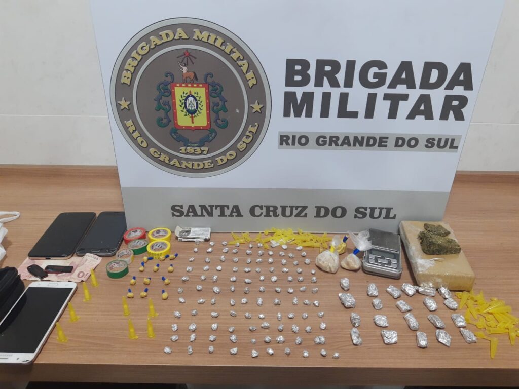 Na abordagem, foi encontrado com o usuário, o qual comprava droga no momento da ação, quatro pinos de cocaína. Com o homem preso foi encontrada uma sacola, contendo uma porção de maconha, pesando 455 gramas, 21 porções menores da mesma substância, 121 pedras de crack e mais três porções de crack, pesando 31 gramas, uma balança de precisão, três celulares, dois pendrives, 32 pinos vazios, quatro pinos de cocaína, material usado para embalar e fracionar entorpecentes e a quantia de R$ 10.