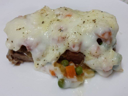 Unte uma forma retangular. Coloque o preparado de carne moída, os legumes refogados, cubra com queijo mozarela, o molho branco e termine com queijo parmesão. Levo ao forno pré-aquecido por 40 minutos.