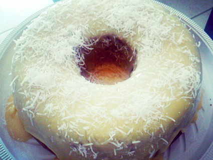Para a cobertura: Misture ½ xícara ou 1 xícara de açúcar de confeiteiro com 1 clara de ovo. Se ficar muito mole coloque mais açúcar. Espalhe por cima do bolo frio e finalize polvilhando coco ralado.