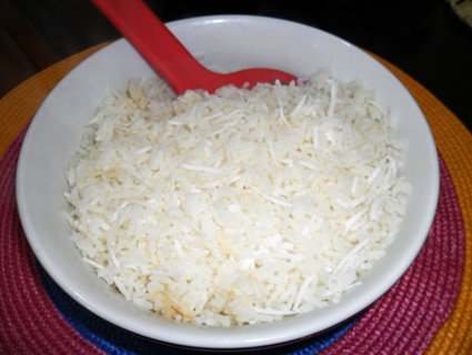 Para deixar mais solto o coco ralado que estava guardado na geladeira, coloque-o numa peneira sobre o vapor da água fervente, com a panela fora do fogo.