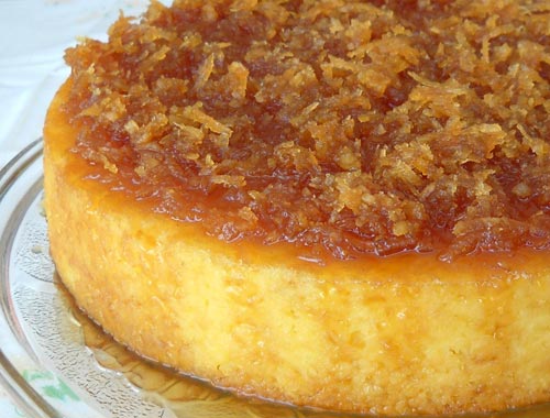 Rale a mandioca no ralo grosso, junte o açúcar, o coco ralado, a margarina, e o sal. No liquidificador, bata a farinha, o fermento, os ovos com leite de coco. Misture à massa de mandioca. Unte uma forma e polvilhe com açúcar e leve para assar em forno médio por aproximadamente 30 minutos. Retire do forno, coloque a calda quente e desenforme frio.