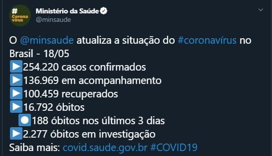 O Ministério da Saúde atualizou nesta segunda-feira, 18, a situação do novo coronavírus no País. A pasta estima que 100.459 pessoas já se recuperaram da doença no Brasil e que, 136.969 estão em acompanhamento. Foram confirmados 254.220 casos da Covid-19, até esta tarde, no Brasil. Já o número de mortes provocadas pelo novo coronavírus é de 16.792 no país.