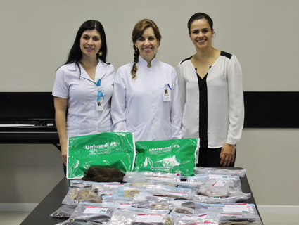 Patrícia Aguiar, da Unimed, Larissa Magalhães e Roberta Rauber, do Hospital Ana Nery durante a entrega da doação das mechas
