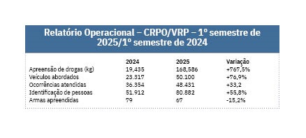 O Comando Regional de Polícia Ostensiva do Vale do Rio Pardo (CRPO/VRP) divulgou nesta semana o relatório operacional relativo aos primeiros seis meses deste ano e os números são positivos na comparação com o mesmo período de 2024. Destaque para o aumento na apreensão de entorpecentes, que alcançou uma alta recorde de 767,5% no primeiro semestre, passando de 19,4 quilos de drogas retiradas das ruas para 168,5 quilos.