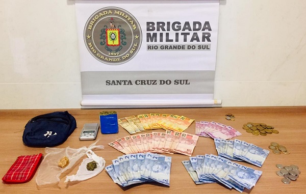 Na tarde desta quarta-feira, 28, a Brigada Militar de Santa Cruz do Sul, através dos policiais da Força Tática, prendeu um homem, de 23 anos, no Bairro Santa Vitória. Ação ocorreu durante ações de polícia ostensiva, próximo a um local conhecido pela traficância de drogas foi visualizado um homem, o qual na tentativa de abordagem empreendeu fuga. Em seguida, o homem foi alcançado e revistado, sendo encontrado na cintura uma necessaire azul, na qual estava uma balança de precisão, 120,8 gramas de maconha, 22,2 gramas de crack, R$ 520,10 e uma niqueleira vermelha pequena.