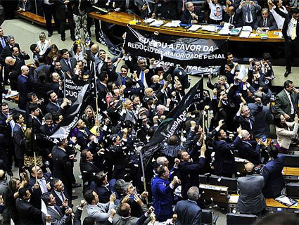 O texto aprovado é uma emenda dos deputados Rogério Rosso (PSD-DF) e Andre Moura (PSC-SE) à proposta de emenda à Constituição da maioridade penal (PEC 171/93). Foram 323 votos a favor e 155 contra, em votação em primeiro turno. Os deputados precisam ainda analisar a matéria em segundo turno.