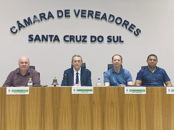 A direção da Câmara de Vereadores de Santa Cruz do Sul em 2024 terá Gerson Luís Trevisan (PSDB) como presidente. Ele foi eleito na tarde de ontem com 16 votos favoráveis e uma abstenção, de Alberto Heck (PT), juntamente com o vice Jair Eich (Progressistas), 1º secretário Raul Fritsch (Republicanos) e 2º secretário Cleber Pereira (União Brasil). Assim, se completa o revezamento entre as maiores bancadas na presidência, estabelecido em acordo pluripartidário no começo da legislatura.