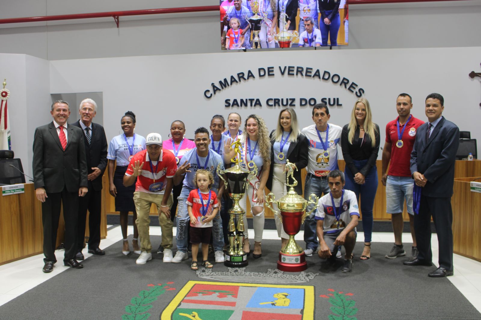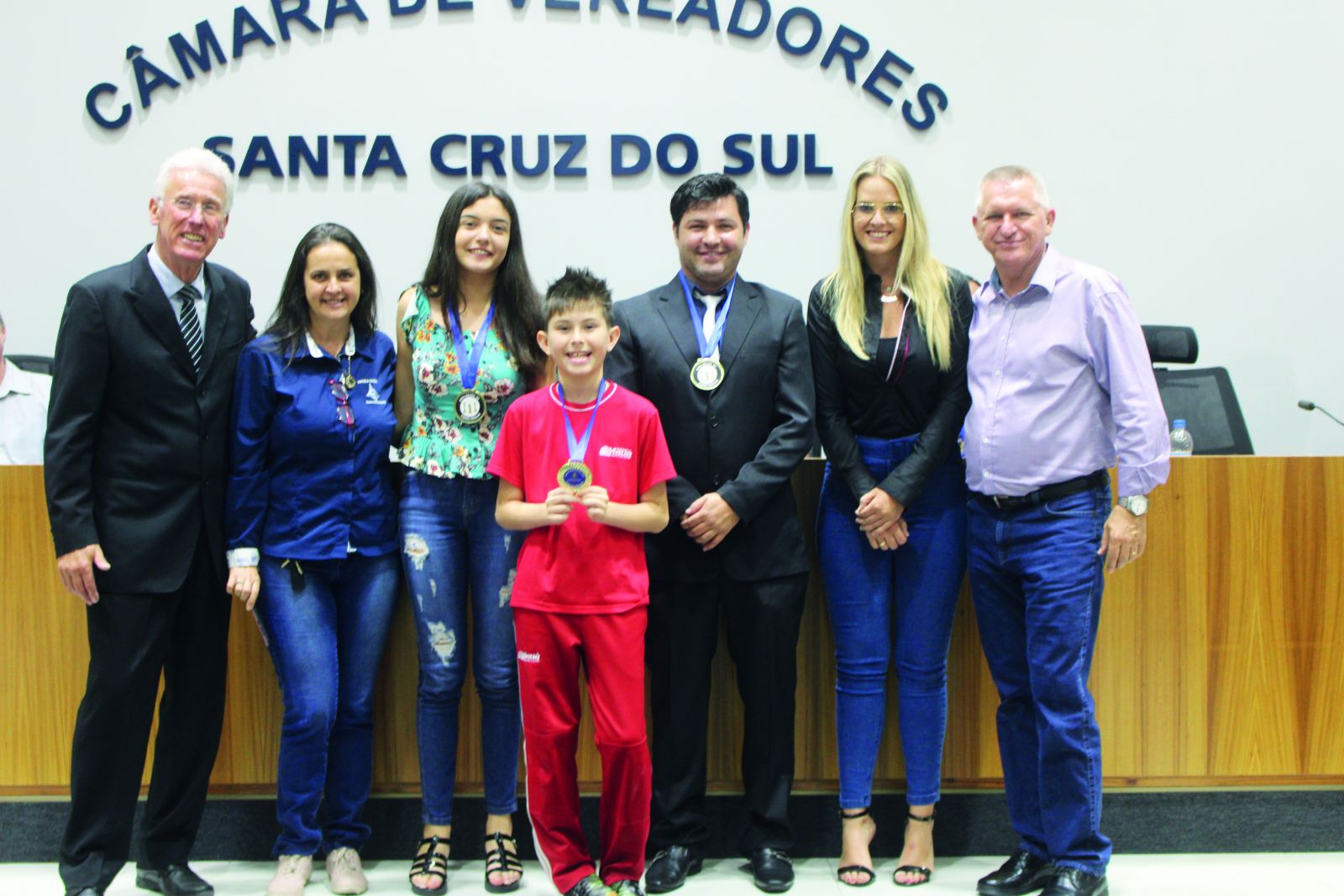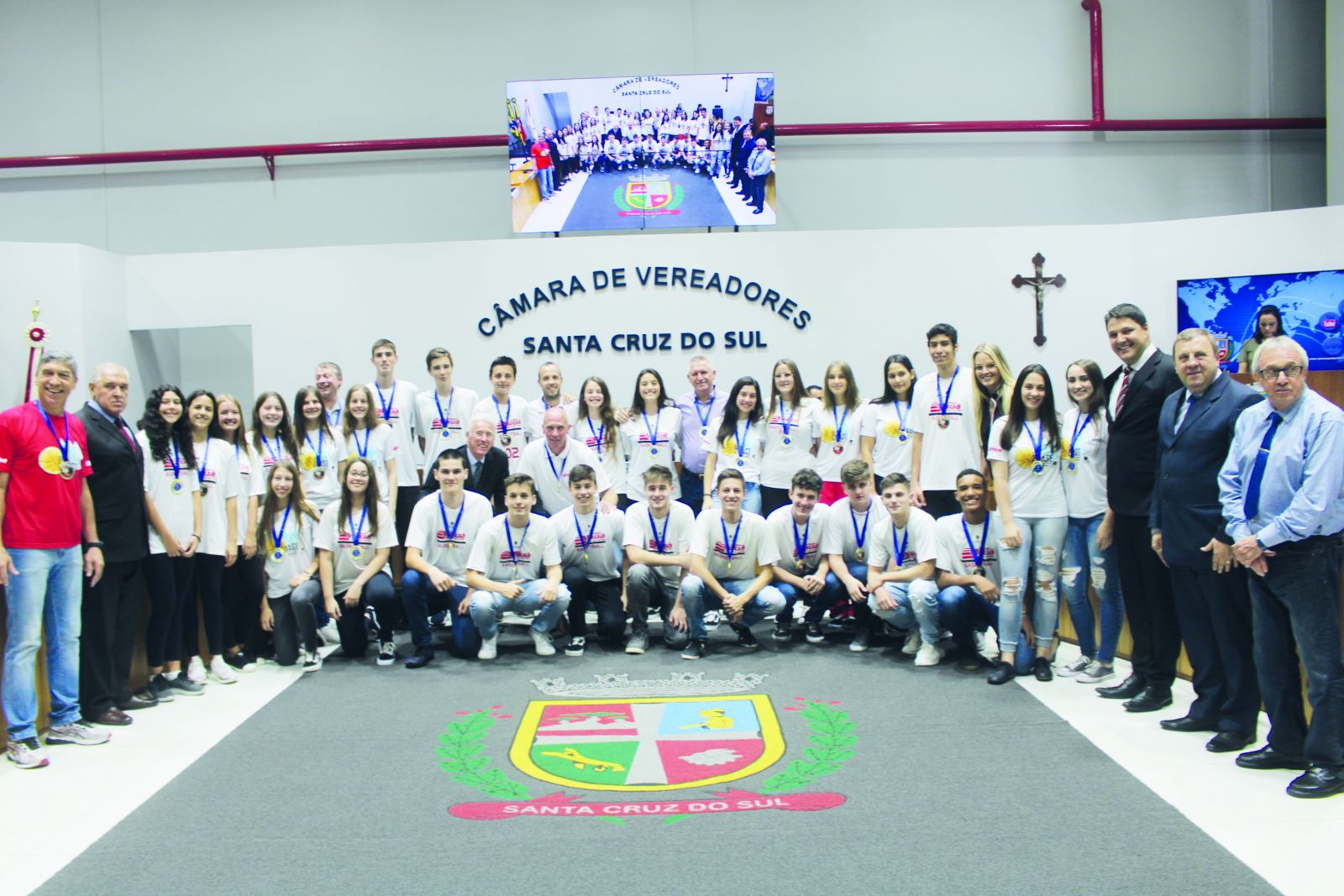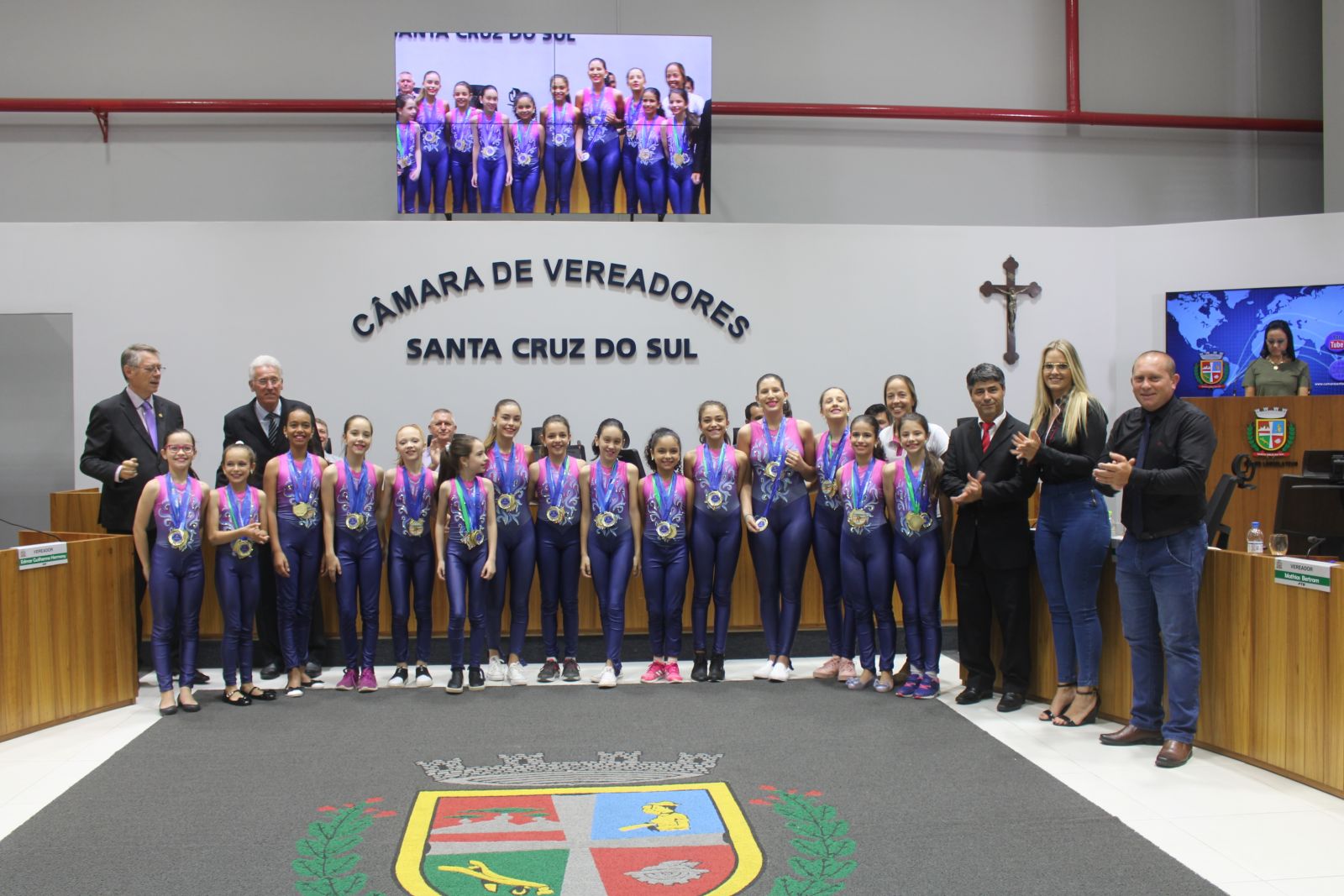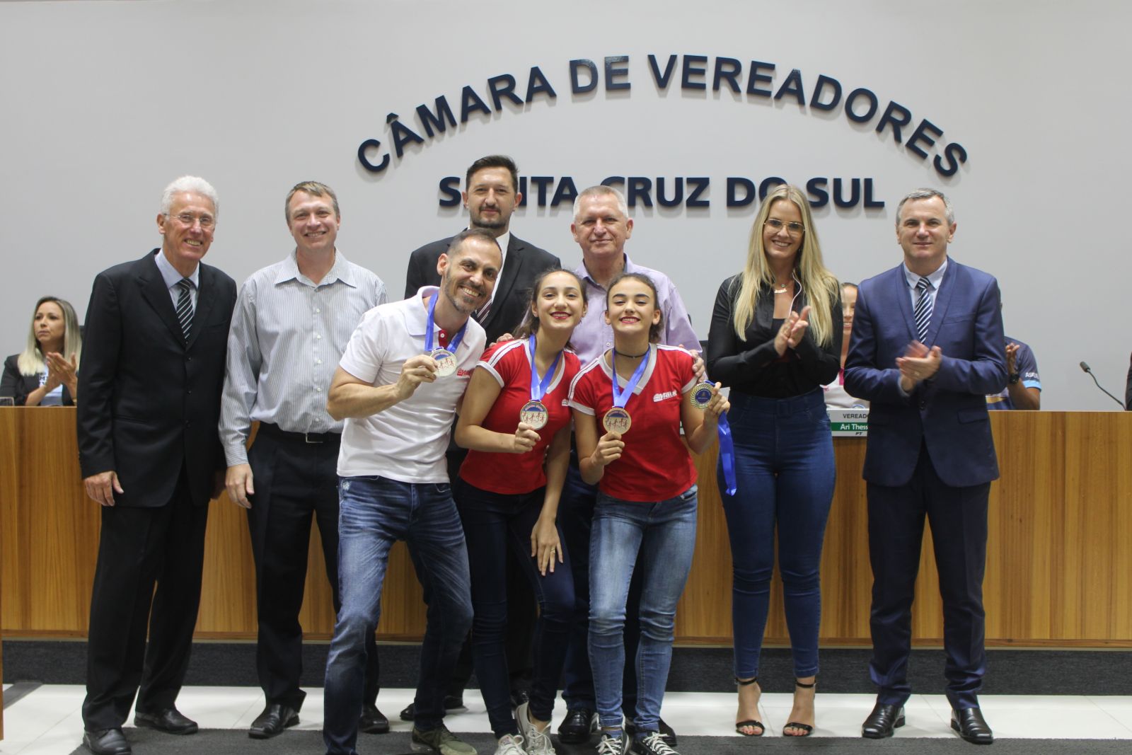 A sessão foi conduzida pela presidente Bruna Molz (PTB) e a mesa composta por Fabiane Helena Knak, coordenadora do Clube Xlise de Patinação; Nestor Raschen e Martin Goldmayer, respectivamente diretor e vice do Colégio Mauá; Celso Bobrowski, representante da Aspede Santa Cruz; Marciele Fernandes, presidente do CF Bom Jesus e Flávio Henrique Schedler, treinador de xadrez. A proposição foi dos vereadores Hildo Ney Caspary e Edmar Hermany (Progressistas).