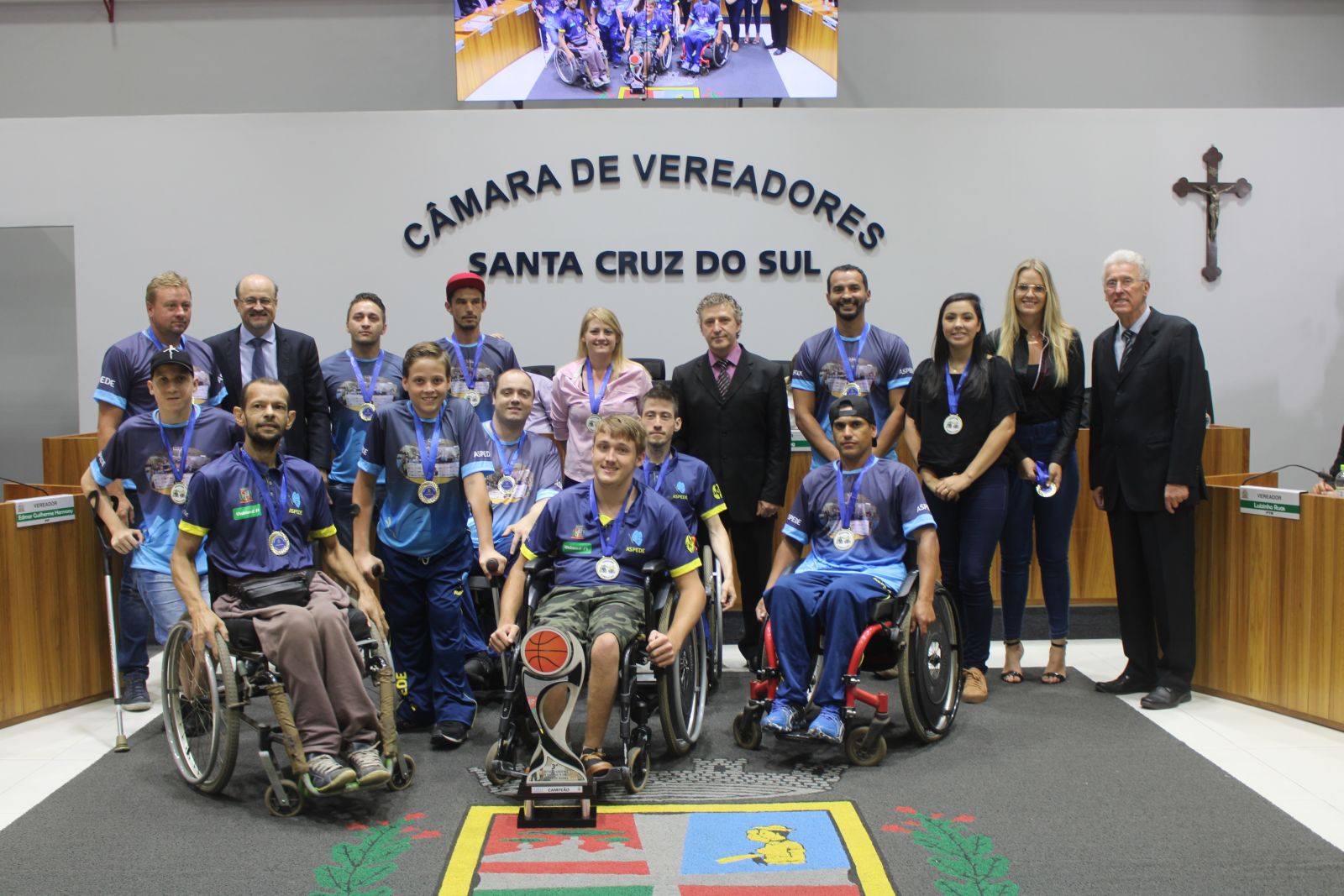 Aspede Santa Cruz do Sul – basquete sobre rodas: Os atletas da Associação Santa Cruzense de Pessoas Portadoras De Deficiência Física (Aspede) conquistou o título de campeão gaúcho de basquete sobre rodas. A Aspede tem 22 anos de existência em como objetivo a promoção integral da pessoa com deficiência física, a fim de que a mesma possa romper com toda e qualquer barreira que a impeça de participar ativamente da sociedade. A final do Campeonato Gaúcho De Basquete em Cadeira de Rodas 2019, foi realizada no dia 25 de outubro, em Caxias Do Sul, onde a equipe santa-cruzense venceu os quatro jogos que disputou, incluindo a final contra a Adau, de Erechim, por 26 a 22. Os homenageados são: Alison Geller, Antônio Fernando Borba, Cassiano José Haas, Cinélio Zingler, Eliandro Vizzotto, Gabriel Magerl, Julhiano Caiel Rodrigues, Matheus Kist, Rafael Terres, Roger Oliveira, Fernando Muller, Eduardo Boelter Pinto. A equipe técnica é composta por Celso Bobrowski (técnico); Paulo Kist (auxiliar técnico); Imaiara Dias e Daniela Reinicke (Fisioterapia).