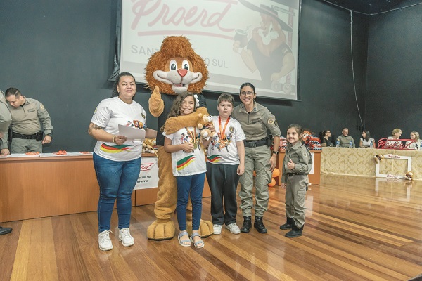 A cerimônia teve início com a entrada dos instrutores sob o aplauso da plateia. Na sequência todos cantaram o Hino Nacional e medalhas e certificados foram entregues aos alunos destaques das escolas participantes. A agitação no auditório ficou por conta da presença de um convidado especial, o leão Daren, mascote do Proerd. Música, dança e muita animação marcaram a cerimônia que encerrou com sorteio de brindes e distribuição de lanches.