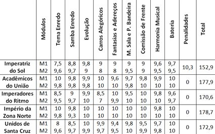 O terceiro lugar foi para a Unidos de Santa Cruz, que obteve 172,9 pontos e levou o enredo “Eliseu, de um sonho de magia a mestre da tecnologia”. A quarta colocação foi para a Imperadores do Ritmo, que obteve 170,6 pontos. A Imperatriz do Sol teve a penalização de 10,3 pontos, ficando com 152,9 no geral.