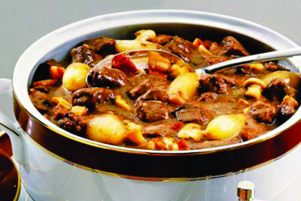 Doure a cebola e o bacon na manteiga. Retire o bacon e a cebola. Reserve. Ponha a carne na panela e doure-a na mesma gordura que fritou o bacon. Espalhe a farinha de trigo por cima, mexa e deixe dourar. Adicione o caldo de carne. Junte o bacon e a cebola reservados. Acrescente o vinho. Tempere com mais sal, pimenta, a salsa, o louro e o tomilho. Cozinhe em fogo baixo por duas horas. Adicione o champignon e cozinhe por mais 30 minutos antes de servir.